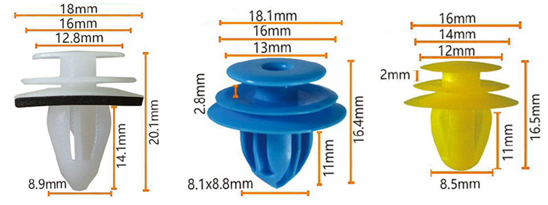 Chốt kẹp nhựa là loại ốc vít bảng điều khiển cửa phổ biến nhất và thường được làm bằng nhựa kỹ thuật cường độ cao. Loại khóa này là nhẹ, chi phí thấp, chống ăn mòn, v.v., và rất phù hợp để sản xuất hàng loạt.